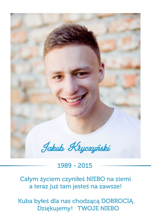 15 sierpnia 2015 roku Jakub Kryczyński przeszedł do Wieczności. Przeżył na tej Ziemi 26 lat, z których ostatnie półtora roku było dla niego dzielną walką z chorobą nowotworową i cierpliwym znoszeniem uporczywych skutków chemio i radioterapii.
